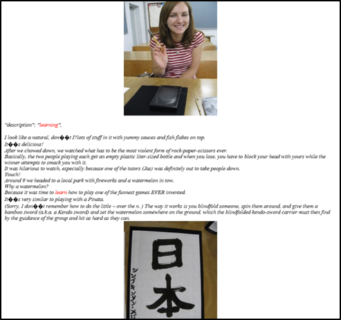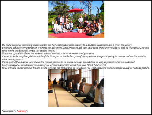 システムの動作例として,“learn (学ぶ)”と入力した場合の出力結果例を図2に示す.図2は書道体験と禅体験に関するブログであり,両者は「旅行者が日本文化について学ぶことができる」という点で類似している.このように,類似体験型地域を並べて表示・比較することで,ユーザは地域ごとの特色を知ることができる.