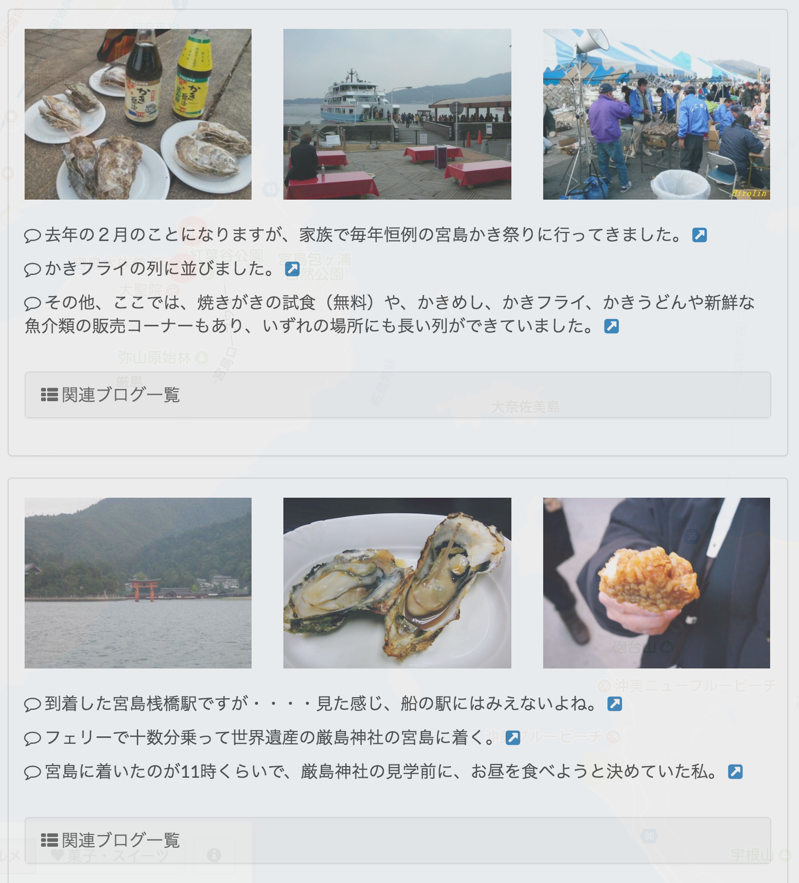 次に,本研究で構築した自動要約システムを中心に,既存システムからの拡張点について説明する.画面左下の緑のボタンをクリックすると,画面上に表示されているブログを自動要約し,ポップアップウィンドウ内に,その結果が表示される.図4,5は広島県の宮島付近でタイプ“見る”,“食べる”に該当するエントリ集合をそれぞれ自動要約した例である.同じ地点でも,“見る”を選択したときは「厳島神社」や「水中花火大会」,“食べる”を選択したときは「牡蠣祭り」のように,選択したタイプに沿った要約を自動生成することができる.