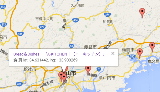 上記の技術を用い,地図から関連ブログを探すことができるようになった.以下,図1にシステムのスナップショットを示す.ユーザは,地図上のピンをクリックすることで,該当するブログに直接アクセスすることが可能となっている.