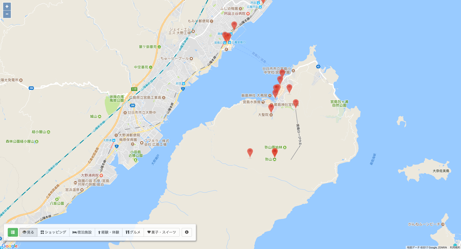 このシステムは,試験的に研究代表者が所属する大学のWebサーバ上で公開している (http://www.ls.info.hiroshima-cu.ac.jp/cgi-bin/travel/world/map.cgi).また,広島以外のいくつかの地域に関しては,グレック株式会社からiOSアプリおよびandroidアプリとして公開されている(http://japan-travel-guide.jp/).