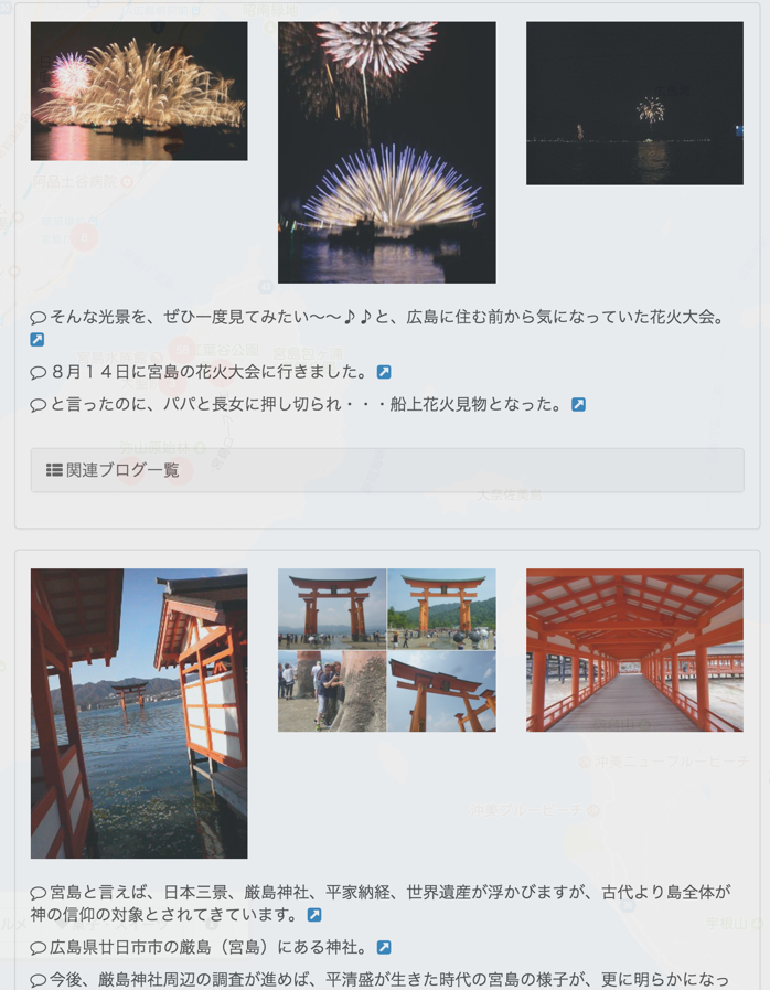次に,本研究で構築した自動要約システムを中心に,既存システムからの拡張点について説明する.画面左下の緑のボタンをクリックすると,画面上に表示されているブログを自動要約し,ポップアップウィンドウ内に,その結果が表示される.図4,5は広島県の宮島付近でタイプ“見る”,“食べる”に該当するエントリ集合をそれぞれ自動要約した例である.同じ地点でも,“見る”を選択したときは「厳島神社」や「水中花火大会」,“食べる”を選択したときは「牡蠣祭り」のように,選択したタイプに沿った要約を自動生成することができる.